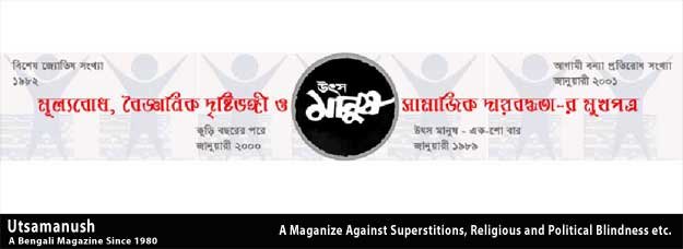 Utsamanush is a magazine, for the common people, published in Bengali. It was first published in 1980 by a group of highly motivated young people in Kolkata (Calcutta), India. The Source (Utsa) of all the materials in these magazines is people (Manush). If there is one magazine, that focuses on issues involving problems and concerns of the common man, it is Utsamanush. It promotes intolerance for superstitions, unscientific attitudes based on past fears and an ignorance of reality based on religious blindness. It also helps to educate people on inhumane acts by the governments. The goal of this magazine is to bring the truth behind superstitions, find the causes behind injustices done to people, and to look into every aspect of life scientifically and logically for a better living environment on this earth.